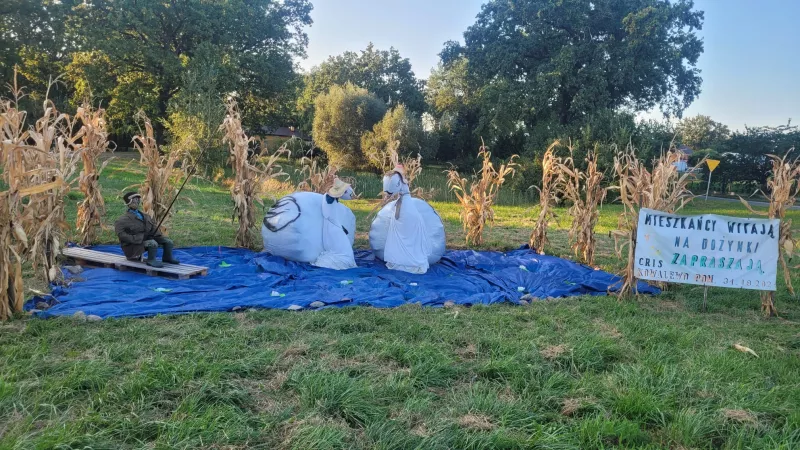 Odkryj witacz dożynkowy "Chełmoniec" w gminie Kowalewo Pomorskie, ozdobiony symbolami rolnictwa.