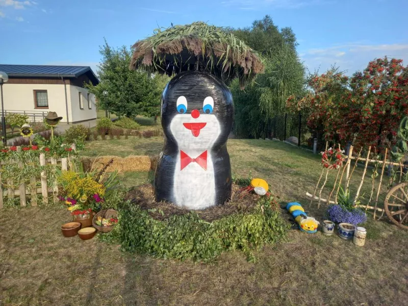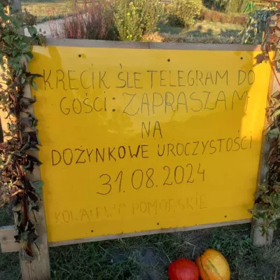 Odkryj witacz dożynkowy "Srebrniki" w gminie Kowalewo Pomorskie, ozdobiony symbolami rolnictwa.